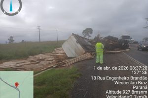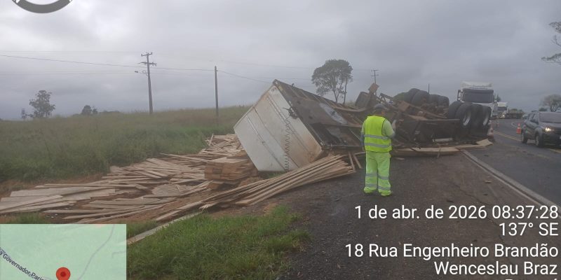 Carreta se solta de caminhão e tomba na PR-092, em Arapoti