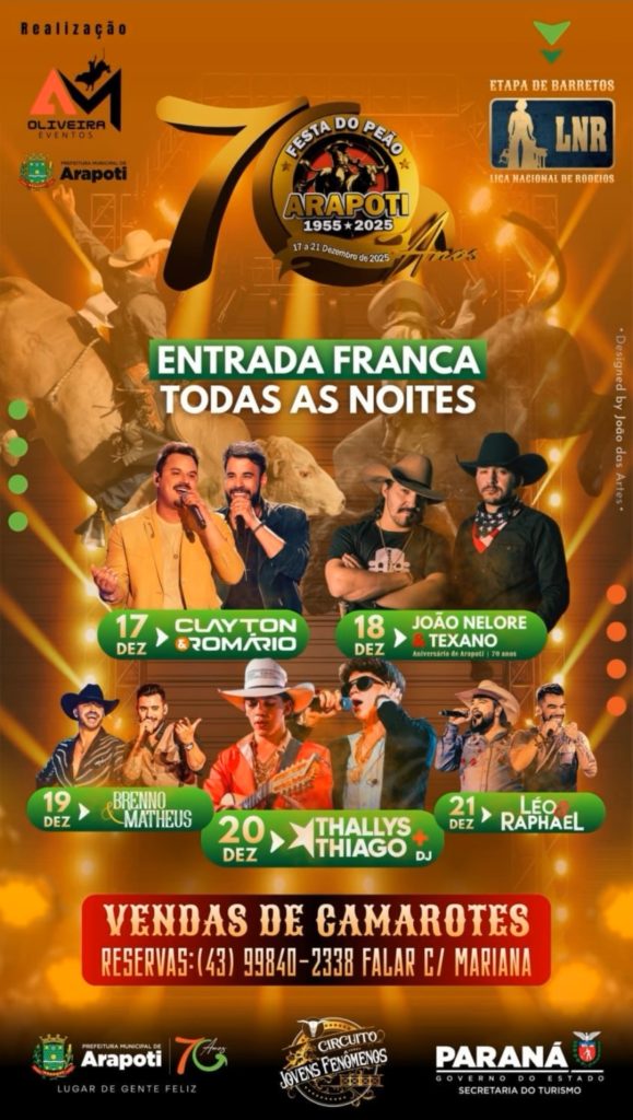 Arapoti – A Prefeitura confirmou nesta segunda-feira (8) a última atração que faltava para completar a programação da Festa do Peão de Boiadeiro 2025, que celebra os 70 anos do município. O show da dupla João Nelore & Texano, marcado para o dia 18 de dezembro, passa a integrar oficialmente a grade musical do evento.