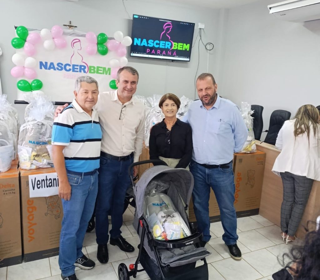 Arapoti – O prefeito Irani Barros, acompanhado da secretária de Assistência Social, Débora Campos, e da coordenadora dos CRAS, Marisa, estiveram em Ventania para receber 60 kits do programa Nascer Bem, entregues pelo Secretário de Desenvolvimento Social e Família do Paraná, Rogério Carboni.