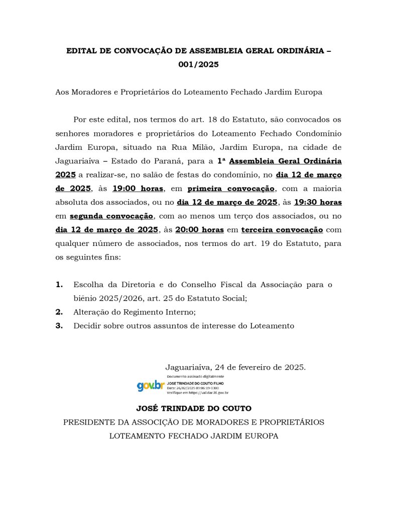 Início > Uncategorized > EDITAL DE CONVOCACAO DE ASSEMBLEIA GERAL ORDINARIA 2025 Uncategorized EDITAL DE CONVOCACAO DE ASSEMBLEIA GERAL ORDINARIA 2025 Por Folha Paranaense 28 de fevereiro de 2025 14:59 Compartilhar: ← Anterior Acidente na PR-151 em Jaguariaíva deixa um ferido Próxima → Novo livro do historiador Rafael Pomim resgata administração do Prefeito Tidoca em Jaguariaíva