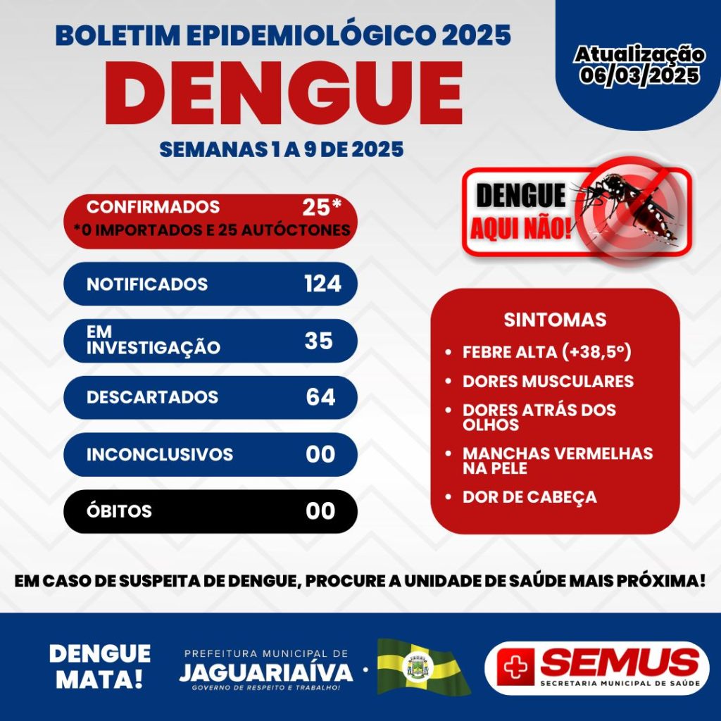 Jaguariaíva – A Secretaria Municipal de Saúde (SEMUS) divulgou nesta quinta-feira, 06, um novo boletim epidemiológico da dengue, apontando um total de 124 notificações da doença no município. Destas, 64 foram descartadas, 25 foram confirmadas (sendo todos os casos autóctones) e 35 seguem em investigação. Até o momento, não houve registro de óbitos relacionados à doença.