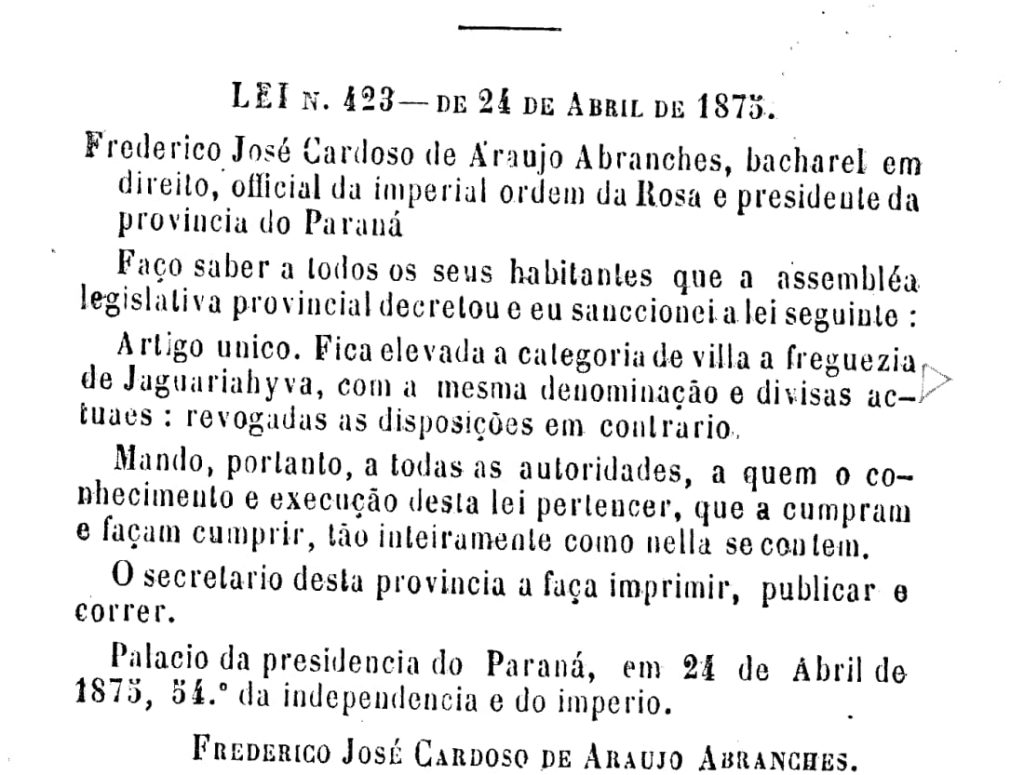 Jaguariaíva – Neste 24 de abril de 2025, a cidade celebra uma data histórica: os 150 anos de sua elevação à categoria de vila, status conferido pela Lei Provincial n.º 423, sancionada em 24 de abril de 1875 pelo então Presidente da Província do Paraná, Dr. Frederico José Cardoso de Araújo Abranches. A elevação representou um divisor de águas no processo de emancipação político-administrativa da localidade, até então subordinada à Vila de Castro.