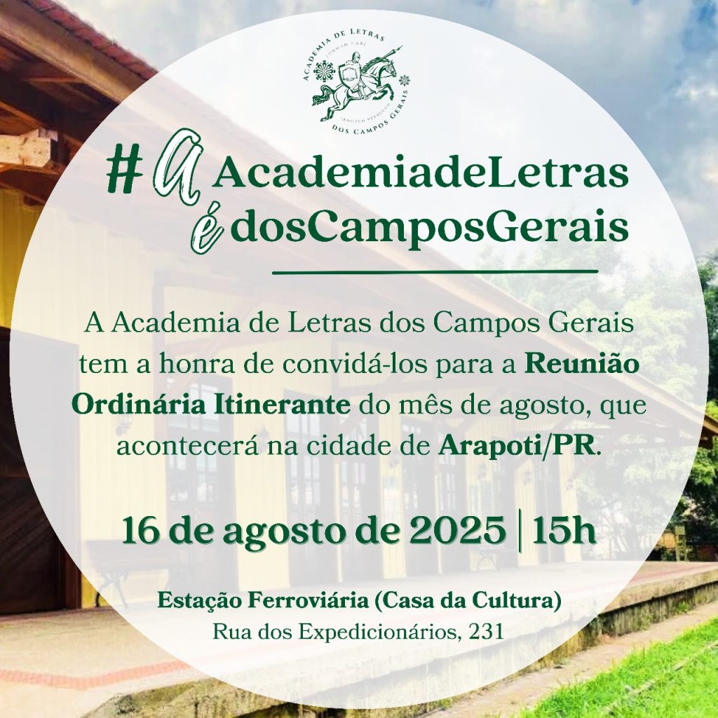 Arapoti – O município sediará no sábado, 16 de agosto de 2025, a Reunião Itinerante da Academia de Letras dos Campos Gerais (ALCG), dentro do projeto “A Academia de Letras é dos Campos Gerais”, que busca aproximar a instituição das diversas comunidades da região e fomentar o intercâmbio cultural e literário entre os municípios.
