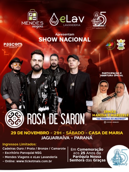 Jaguariaíva – A cidade receberá um grande espetáculo de fé e música no dia 29 de novembro de 2025. Em comemoração aos 25 anos da Paróquia Nossa Senhora das Graças, será realizado um show nacional com a banda Rosa de Saron,