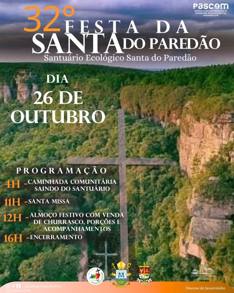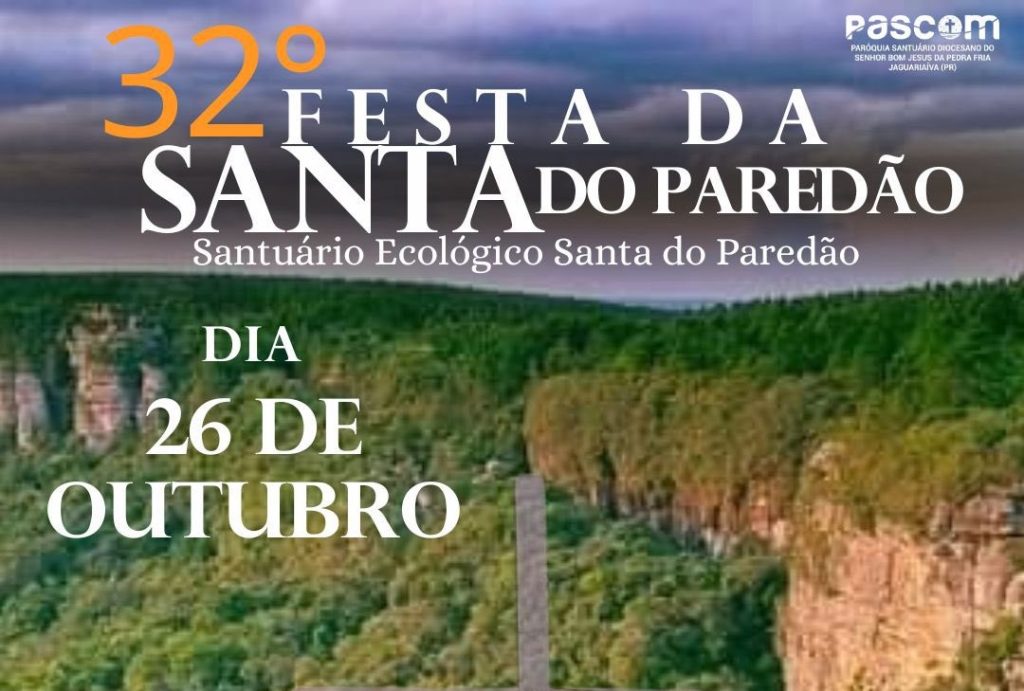 A tradicional Festa da Santa do Paredão chega à sua 32ª edição no próximo dia 26 de outubro, reunindo fé, cultura e tradição em Jaguariaíva. O evento é promovido pelo Santuário Diocesano do Senhor Bom Jesus da Pedra Fria e conta com o apoio da Prefeitura Municipal.