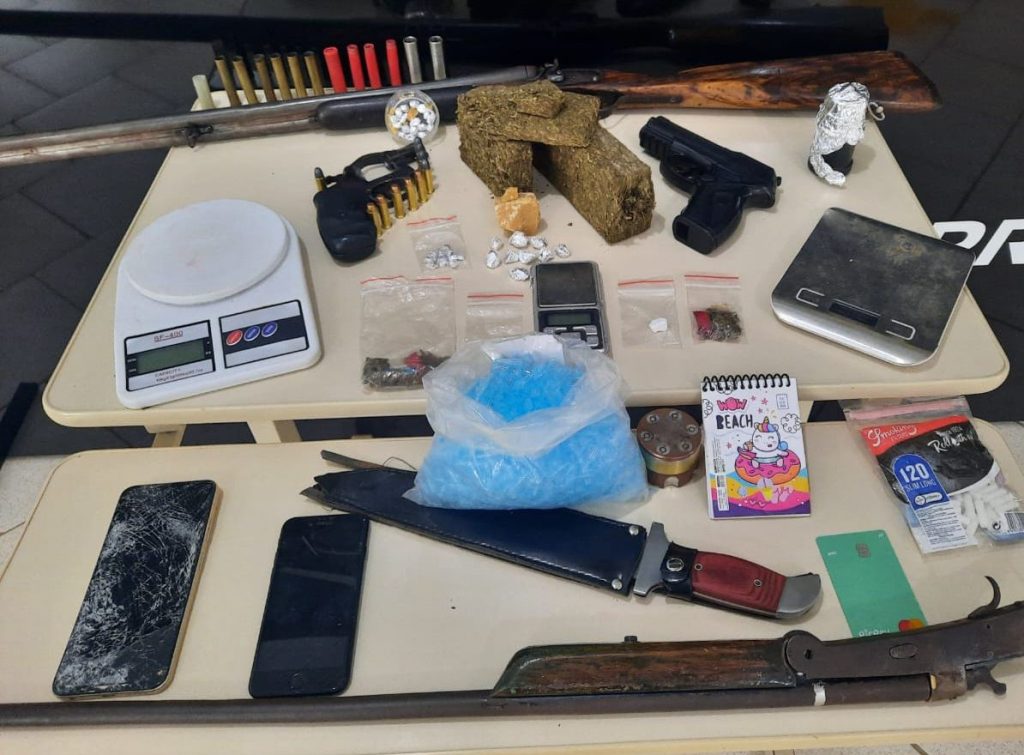 No local, foram encontradas porções de cocaína, maconha e crack, além de balanças de precisão e outros apetrechos ligados ao tráfico. O material bélico apreendido incluía um revólver calibre .38, duas espingardas, munições de diversos calibres e uma réplica de pistola.